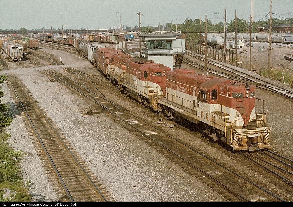 | GP7's #77, 75 & GP9 #403 pull past the west end tower at Frontier Yd. onto the Sycamore Running Track and are headed to Toronto, ON. |