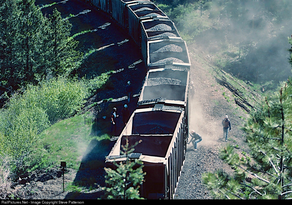 It was a dusty and dirty job for D&RGW laborers dumping and spreading rock ballast at Tunnel 17 near Crescent, Colo. on June 4, 1984.