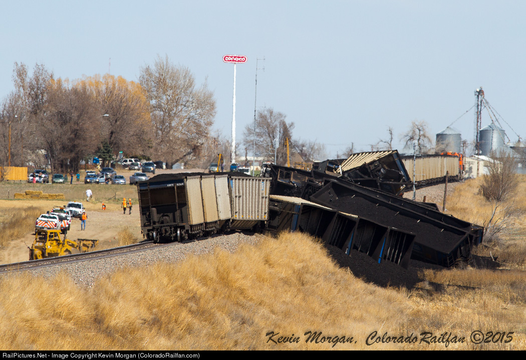 Sunday morning around 10:30am, a westbound coal load headed for Amarillo, TX derailed on BNSF's Brush Subdivision on the west side of Hudson, CO, about 30 miles northeast of Denver. Here, crews are assessing the damage to determine how best to proceed.