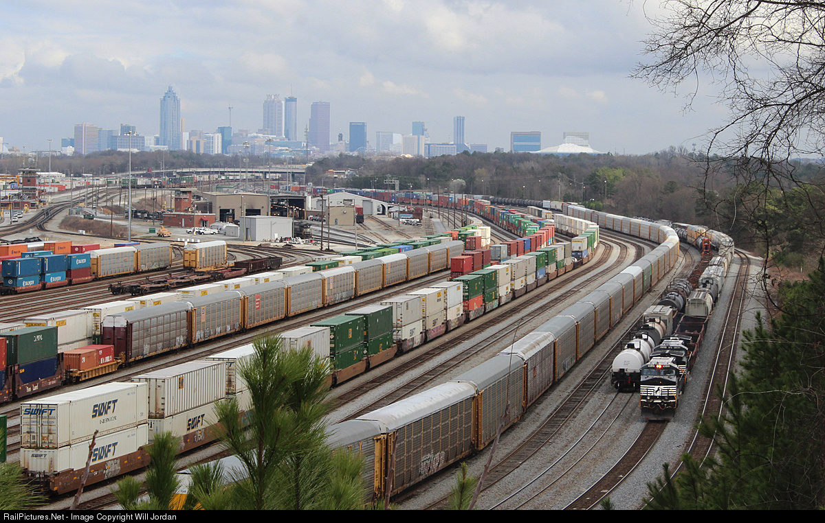 TWO CITIES IN ONE PHOTO Norfolk Southern Inman yard is a city it's self! It's one of the largest yards on the NS system. The Atlanta sky-line backdrops the yard as a long NS freight train passes along the very edge of the yard with a couple dash-9s in the lead.
