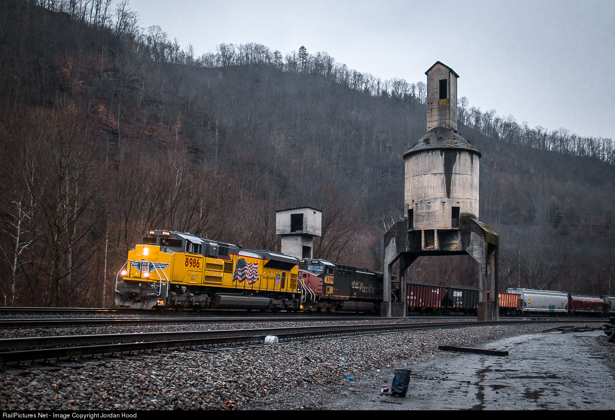 | A nearly factory fresh SD70ACe and patched Southern Pacific AC4400CW begin the eastward trek to Bluefield at dusk on a wet March evening. The ever popular N&W coaling tower is a photo favorite at the location just west of Welch. |