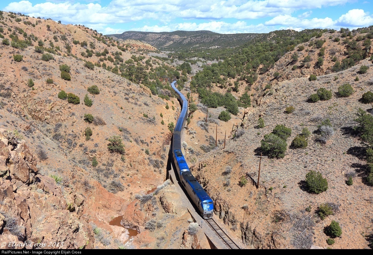 Here's a shot that i've been wanting to capture for quite some time, so I finally decided to make the ascent. Seen here, Amtrak's westbound Southwest Chief #3 slowly negotiates the twists and turns of Apache Canyon, on a warm but windy spring afternoon. Coming in at a length of roughly 900 feet, the train is only slightly shorter than the canyon itself.