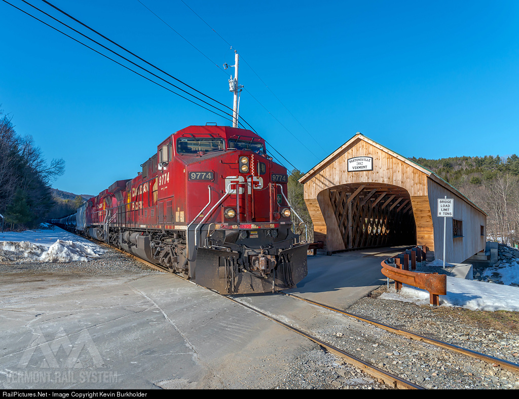 Canadian Pacific Railway's AC4400CWs 9774 and 9808 are leading a little more than half of an 80-car ethanol train over Vermont Rail System's Green Mountain Railroad Bellows Falls Subdivision. The pair of GEs are seen passing the Bartonsville covered bridge on their way to Bellows Falls, VT for delivery to the New England Central Railroad.