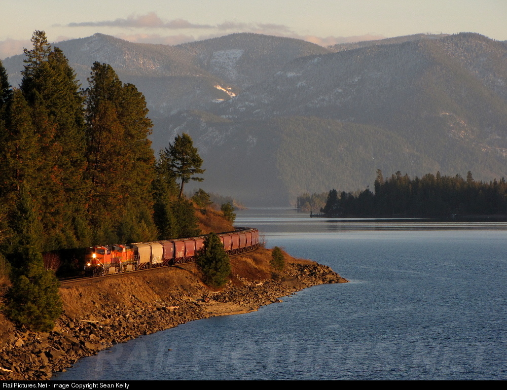 | A westbound unit grain train heads along the shores of Lake Pend Oreille near Trestle Creek, Idaho at the end of a late winter day. |