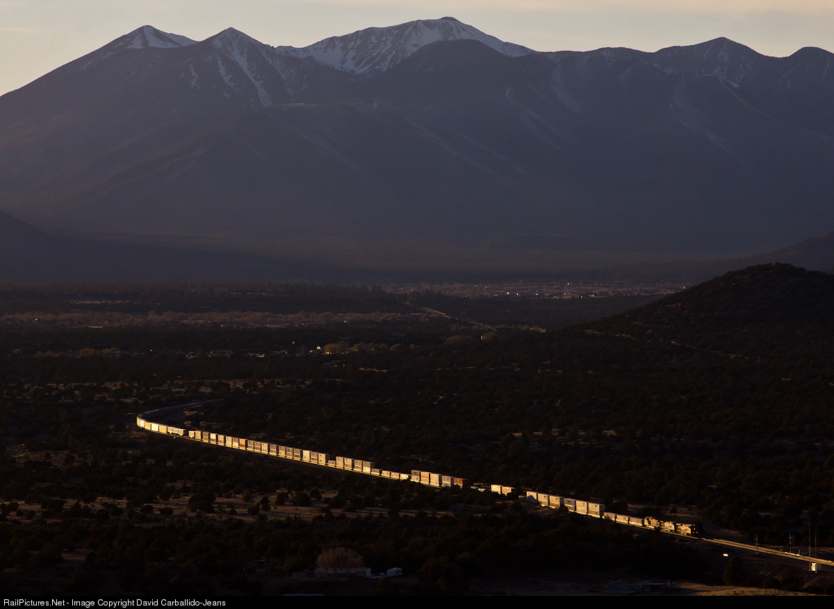 | With the setting sun signaling it's time to head home, an eastbound stack train descends down the Arizona Divide as it heads down the Arizona Divide in the shadows of the San Fransisco Peaks. |