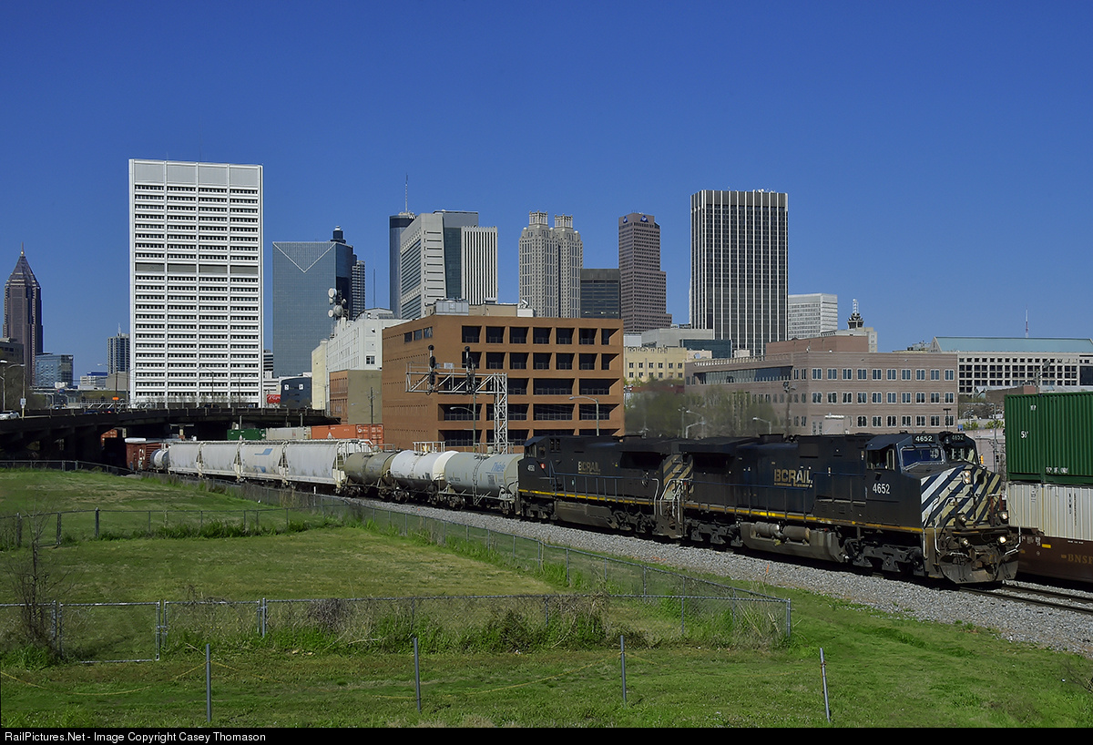 | A pair of BC Rail CW44-9's leads NS train 177 through downtown Atlanta, enroute to Macon, GA, from Chicago. |