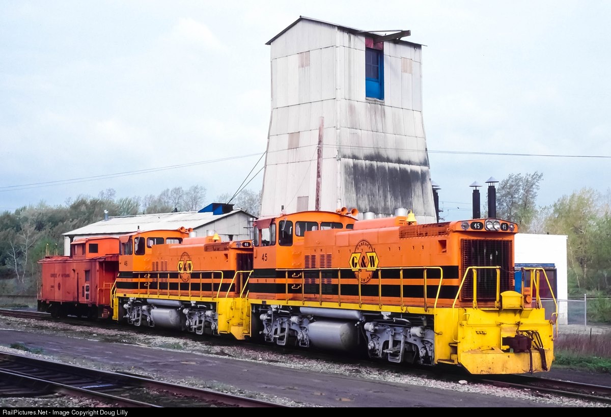 | It all began here - Today the Genesee & Wyoming name and paint scheme can be found on locomotives around the world. In 1983, only two locomotives wore the branding of the G&W, and they are seen here. Ironically the eleven mile long Genesee & Wyoming Railroad was folded into the Rochester & Southern in 2003, and no longer exists as an independent railroad. |