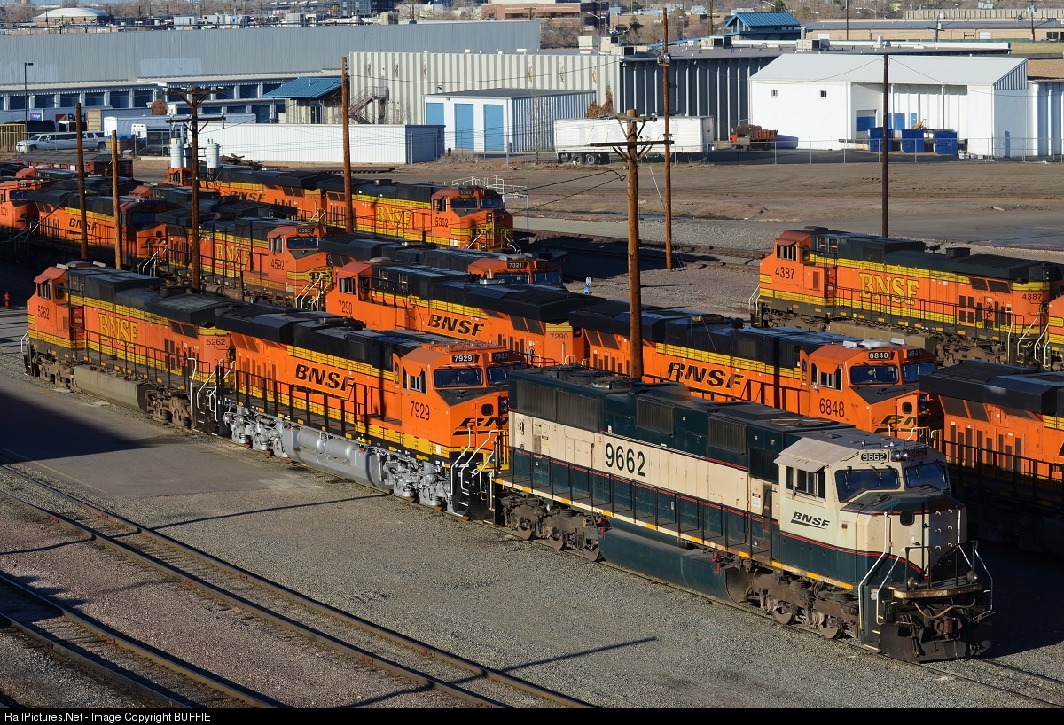 | It seems the BNSF engines sporting the 'Executive' scheme are getting harder to find. Here BNSF 9662 is the sole Mac Daddy among the variety of pumpkins sporting the Heritage II and Heritage III schemes. |