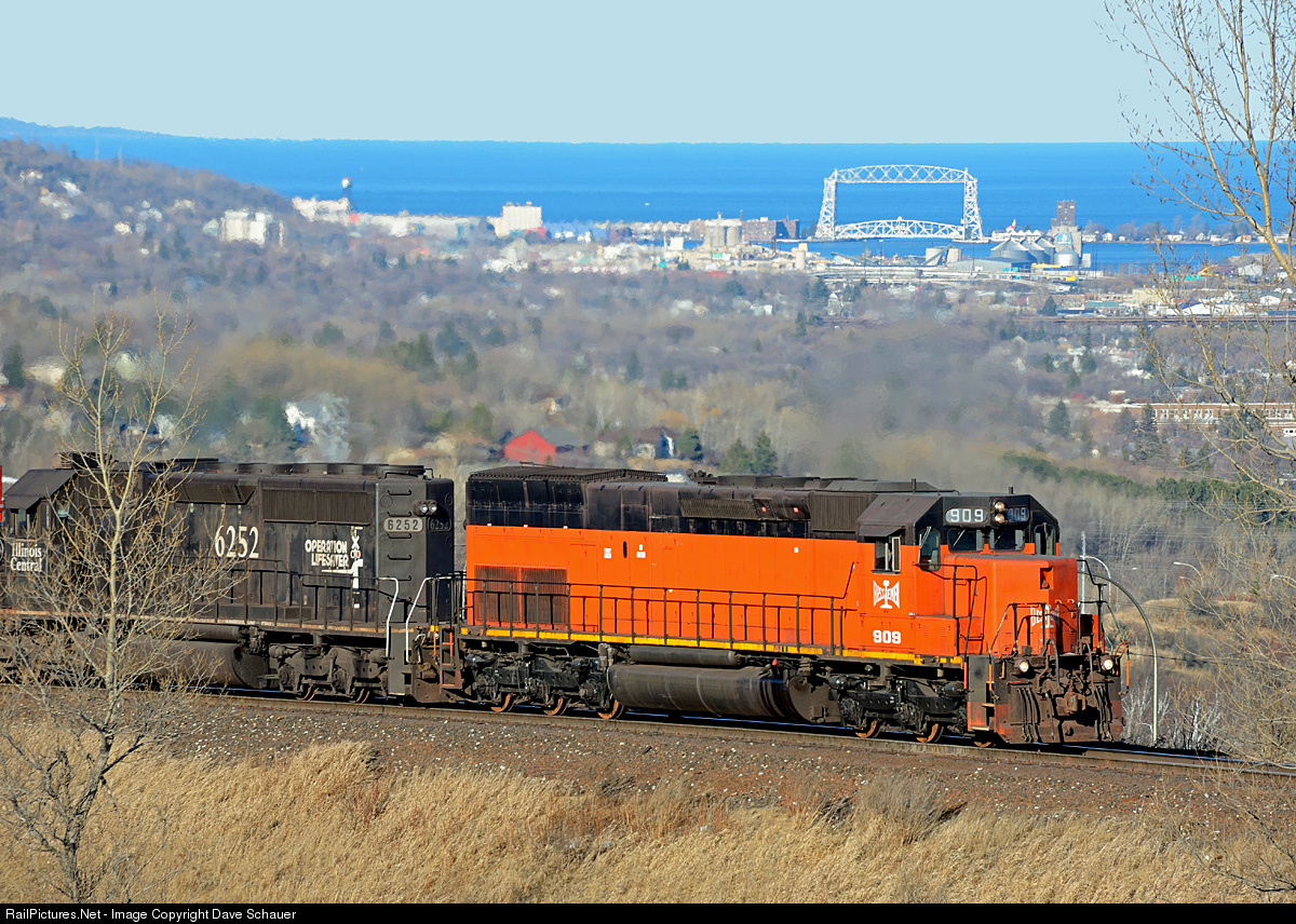 | While CN is replacing Bessemer 900s on their home rails a handful continue to work the former DM&IR in northeastern Minnesota. Here Proctor rebuild 909 leads an empty ore train out of Duluth with the cold blue waters of Lake Superior in the distance. |