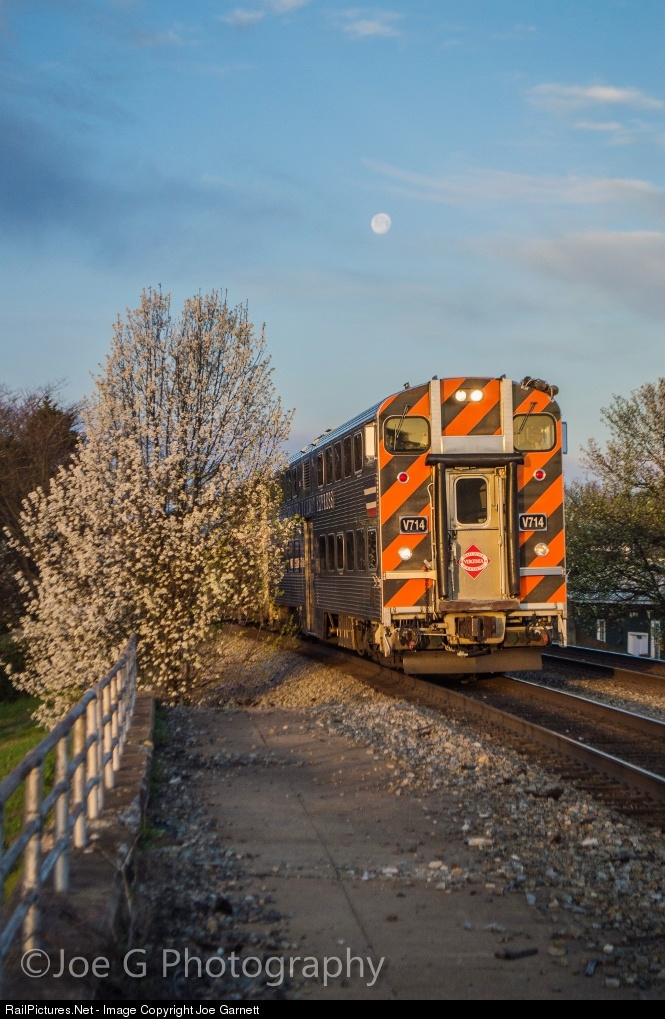 | With the nearly full moon still overhead, and the first sings of spring finally popping up around the area, one of the many VRE Commuter trains is seen pulling into the first station of the morning with the usual Cab Car leading the way. |