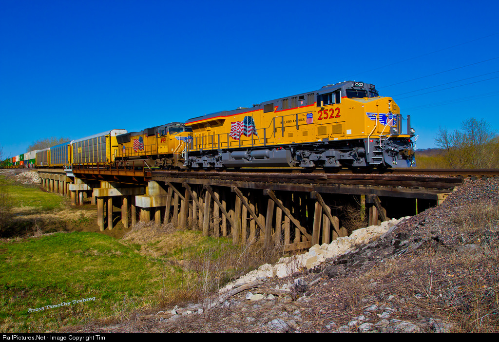 | UP C45AH #2522 along with UP SD70M #4991 hustles UP train KSEMN-31 over the trestle at Fountain, IL running on Track #1 of the UP (ex-MoPac) Chester Sub in the late afternoon of April 4, 2015. |