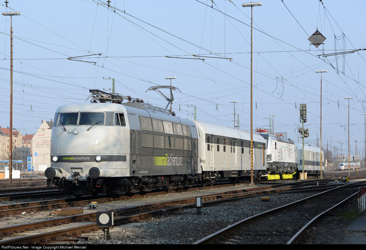| Only a view weeks after revision 103 222 is back on tracks with a train to transfer a new Vectron locomotive from Siemens in Munich to Rostock and the freight is to go to Finland by Ferry. The Vectron has broad gauge and is therefore transported on two railroad carrier Trucks, called "loco buggy". The two formerly luggage waggons have adjustable couplers to the truck carried Vectron and also provide room for stuff and equipment. |