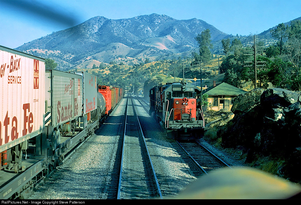 Santa Fe’s Train 2 San Francisco Chief now has a green signal to proceed at Woodford, Calif. after a 2-unit set of SP helpers got in the clear, headed back to Bakersfield. Soon the Chief will be negotiating Tehachapi Loop on July 6, 1967.