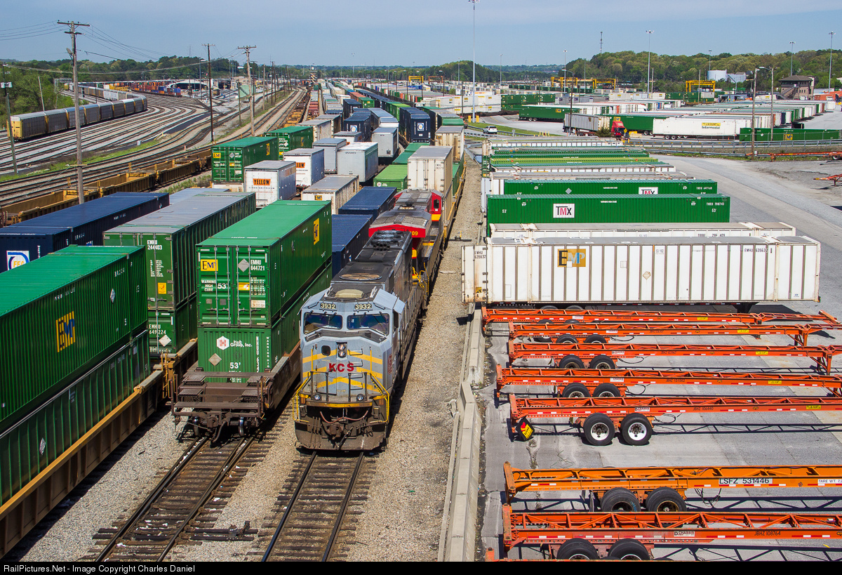 | Kansas City Southern intermodal train I-DAAT (NS 220) terminates at Inman Yard in Atlanta with an increasingly uncommon gray SD70MAC leading. Since the closure of the hump yard a good while ago, Inman Yard is now 99% intermodal traffic, as evidenced by everything in sight from this bridge. |