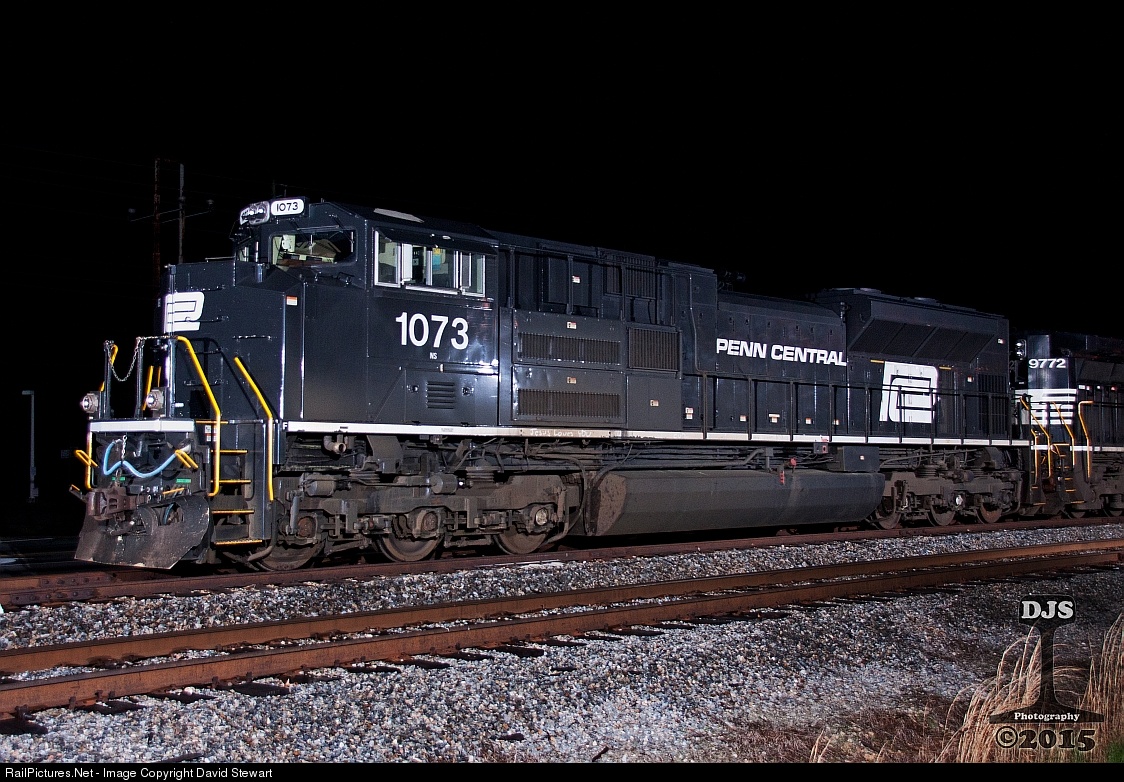 Norfolk Southern's Penn Central Heritage SD70ACe NÂș1073 stands in McDonough, Georgia on April 11,2015