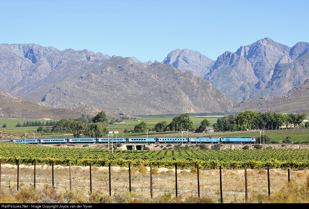 A Premier Classe special in the new Prasa blue livery is seen here behind one of the new Afro 4000 locos on the return trip to Johannesburg running through the vineyards at Sandhills.