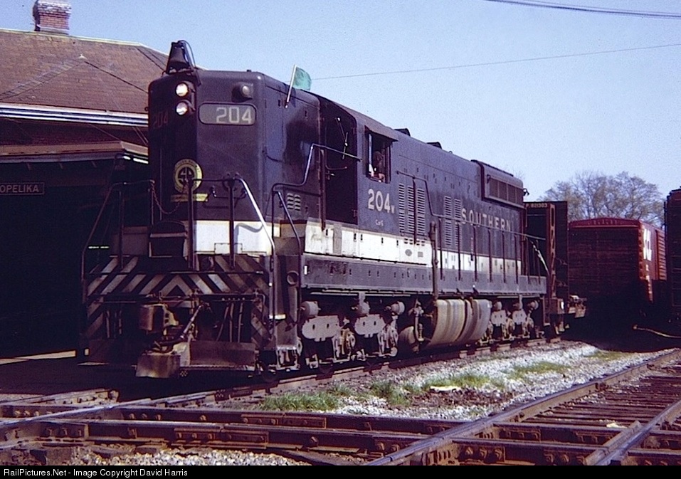 A lone SD9 flying green flags heads west with a mainline local. This is an unusual shot in that, by 1972, Southern's six SD9s and lone SD7 (all inherited from C of G) were generally in captive service in Atlanta and Birmingham. It was also odd to see a road train with a single unit on the Birmingham-Columbus main in those days.