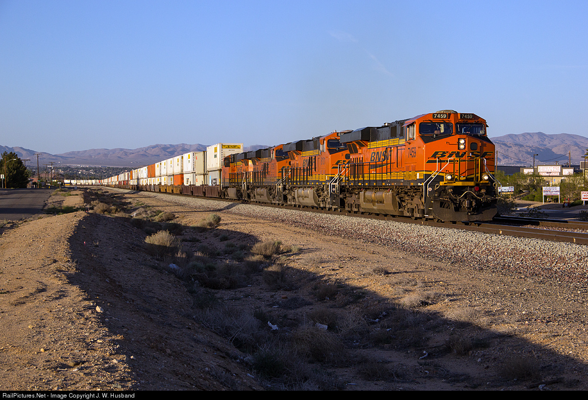 | With the sun low in the sky, a westbound BNSF doublestack train throttles up as it passes through the high desert town of Hesperia located in southern California's Apple Valley. |