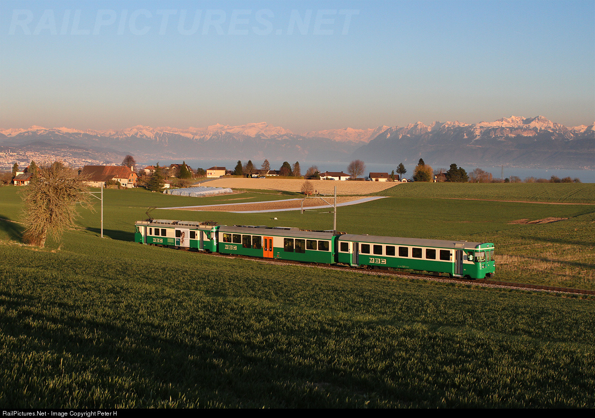 | The last golden sun rays of the day gave their best when the Be 4/4 11 with its regional train left the station of Apples towards Bière. In the background the town of Lausanne (on the left), Lake Genèva and the fresh snowed swiss/french alps are visible. Barely two minutes later the sun has gone and night fell over the lovely countryside. |