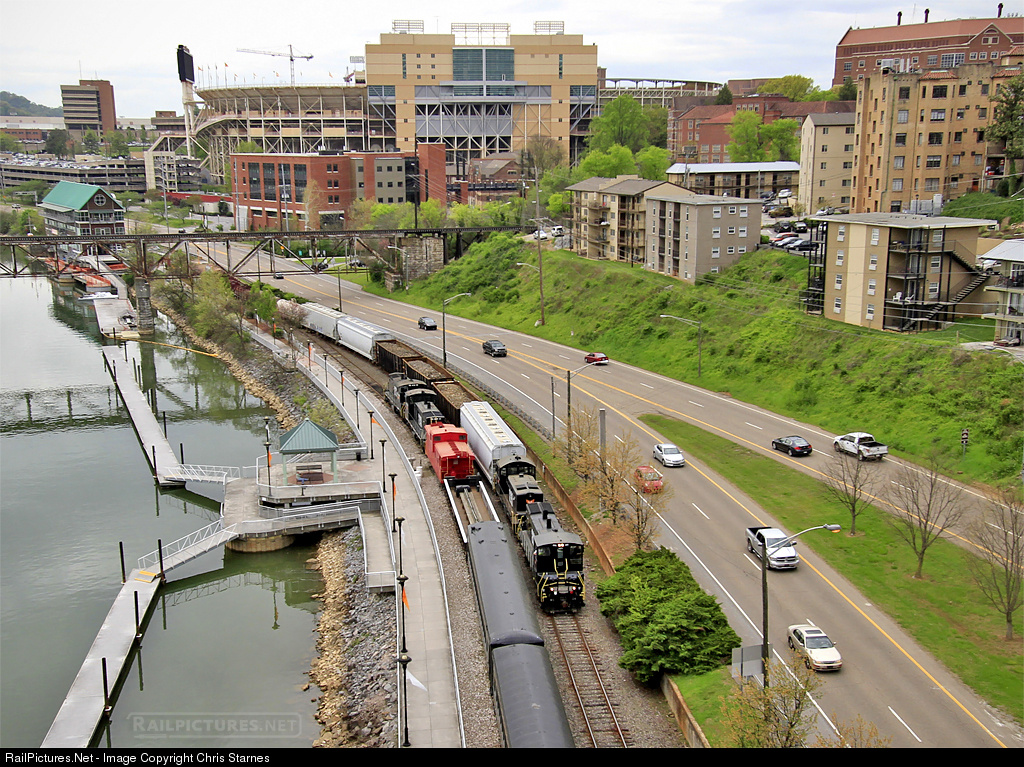 | After a two year rehabilitation, the Henley Street Bridge in downtown Knoxville is back open to traffic and pedestrians allowing this overhead view of the Knoxville riverfront and University of Tennessee campus. KXHR freight train 102 is seen southbound headed to the Forks of the River Industrial Park with the consist for the Three Rivers Rambler scenic excursion train tied down in the siding. |