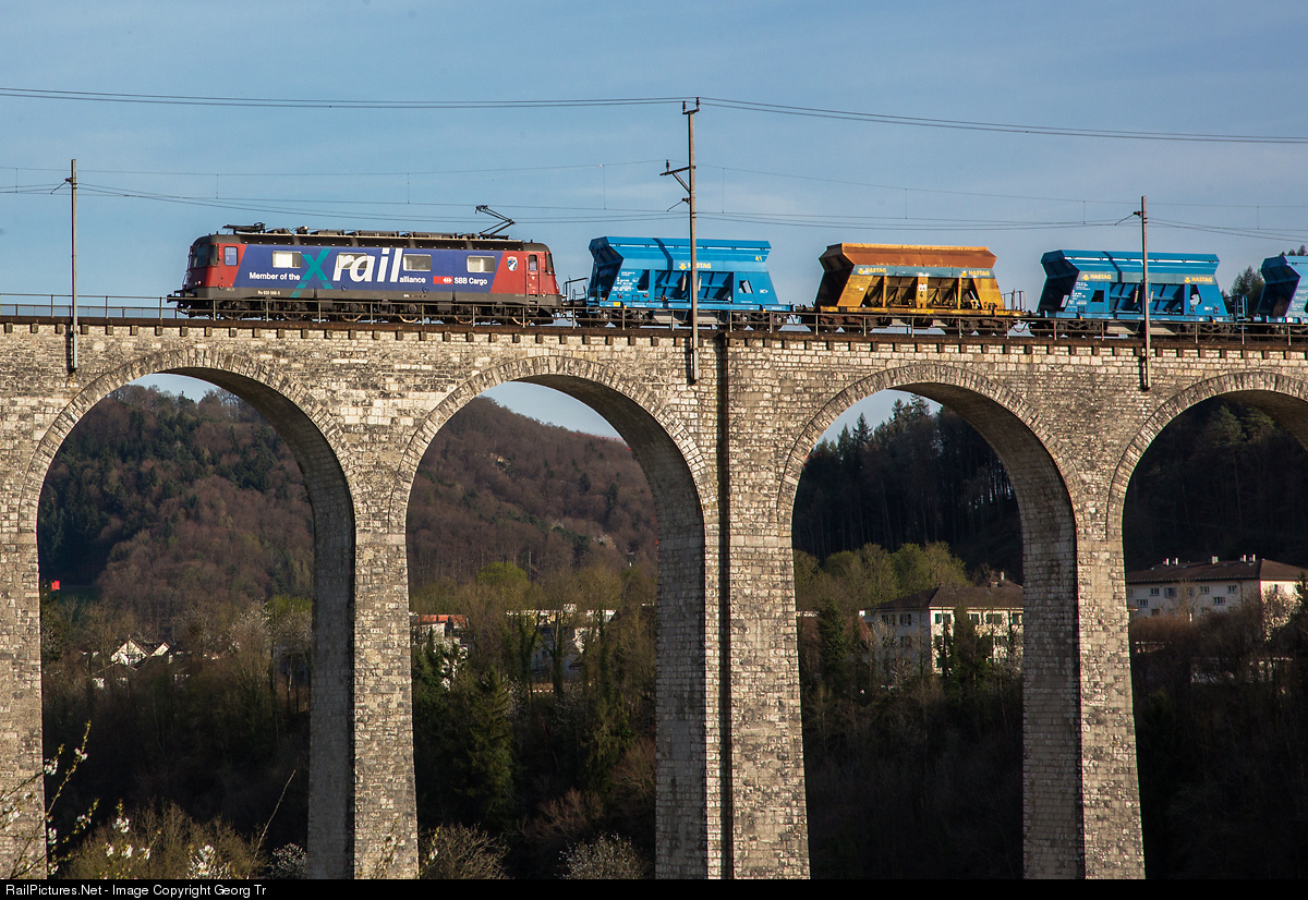 Re 620 (Re 6/6) # 088 "Linthal" is the only of the series with a publicity paint scheme for "Xrail" (inscripton: member of the Xrail alliance) since february 2010. The Xrail alliance of the railways SBB Cargo (Switzerland), SNCB Logistics (Belgium), CD Cargo (Czech Republic), green cargo (Sweden), Rail Cargo Austria (Austria), CFL Cargo (Luxembourg) and DB Schenker (Germany) is a production alliance aiming to render international Wagonload traffic by rail more customer-friendly and efficiently. The Alliance aims to increase the competitiveness of Wagonload traffic in Europe, protecting the environment by offering a more sustainable alternative to road. The Re 620 is pulling an empty gravel train back to Hüntwangen over the Rhine viaduct.