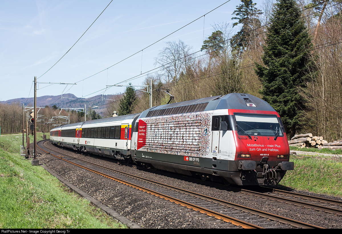 | Re 460 031 has a publicity paint scheme for "Mobil Bonus", decorated with a large number of little portraits of customers of the SBB. You had the possibility to upload your own picture to show it on this locomotive. Re 460 031 is pulling Interregio 2269 Basel-Liestal-Aarau-Lenzburg-Zürich. |