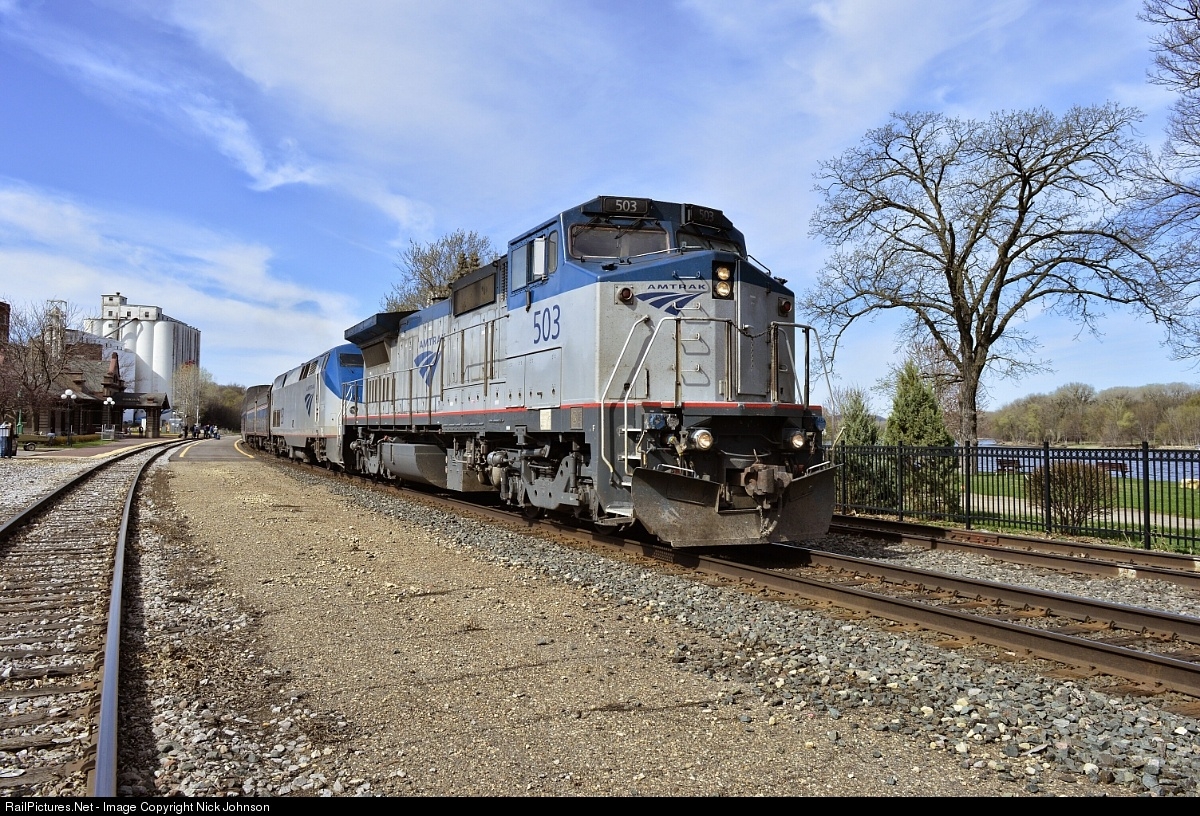 | A rare visitor as AMTK P32-8BWH #503 and AMTK P42DC #93 provide power to Amtrak Empire Builder Train #8 while it sits at the station for it's station stop at Red Wing, MN. Photo taken 4/18/15 near MP 370.5 on the CP River Sub |