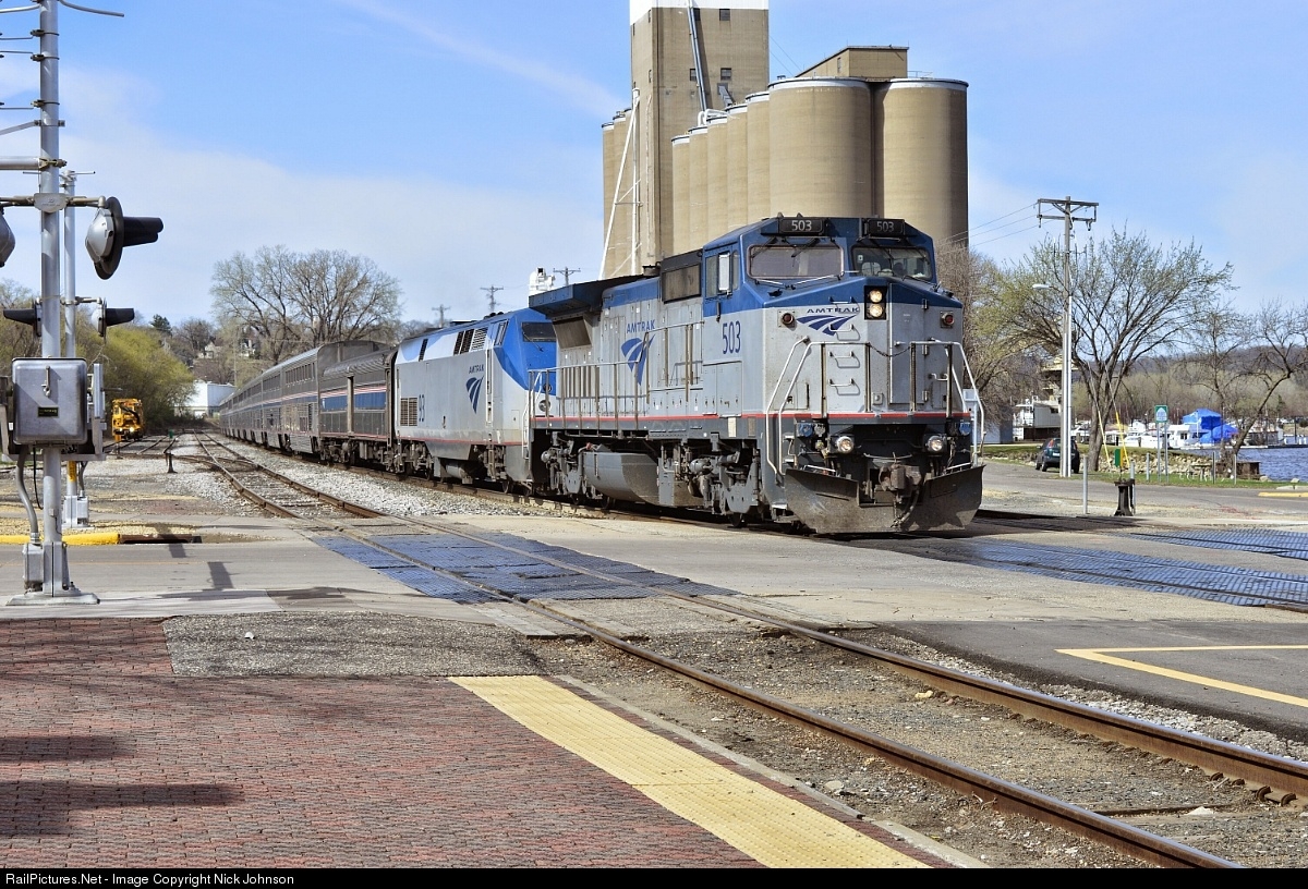 | A rare visitor as AMTK P32-8BWH #503 and AMTK P42DC #93 provide power to Amtrak Empire Builder Train #8 as it pulls in for it's station stop at Red Wing, MN. Photo taken 4/18/15 near MP 370.69 on the CP River Sub |