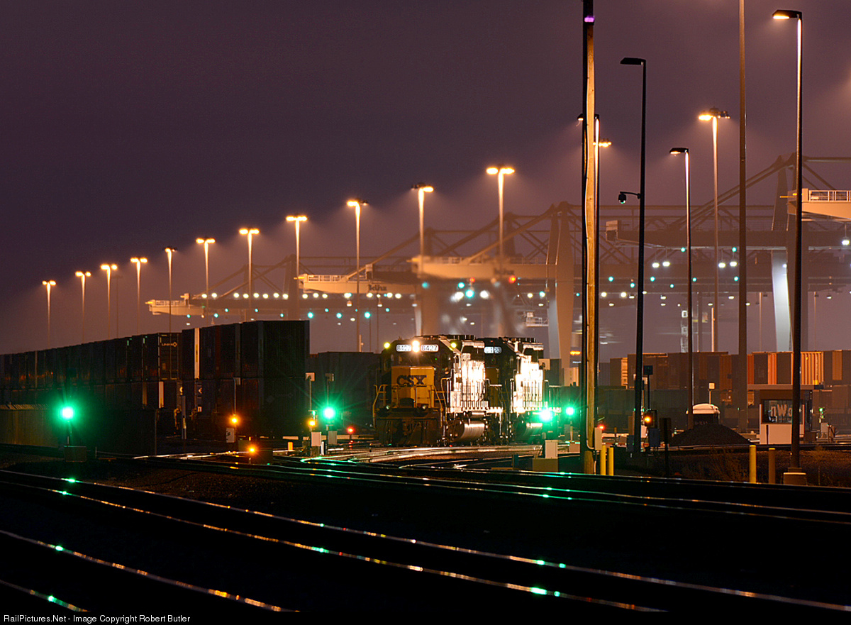 CSX 8427 and 8423 wait in the pre-dawn light and fog for their next move.