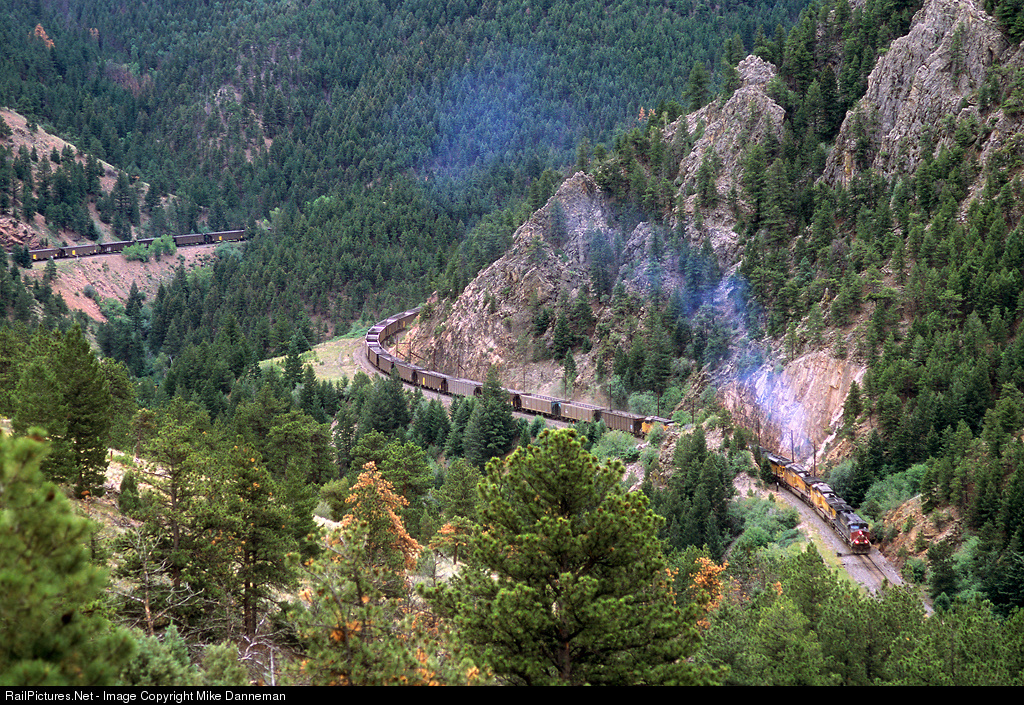 A westbound Union Pacific coal empty, led by a Southern Pacific GE AC4400CW, approaches Tunnel 17 east of Crescent, Colorado, on August 5, 2006. On the left, the middle part of the coal train is between Tunnels 15 and 16.