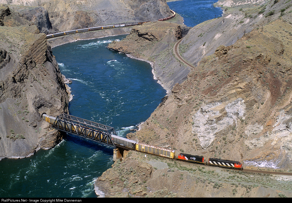 A Canadian National freight crosses the Thompson River in rugged and spectacular Black Canyon west of Ashcroft, British Columbia, on June 25, 2006. Power for the westbound train is a pair of EMDs; SD60F No. 5546 and SD40-2W No. 5358.