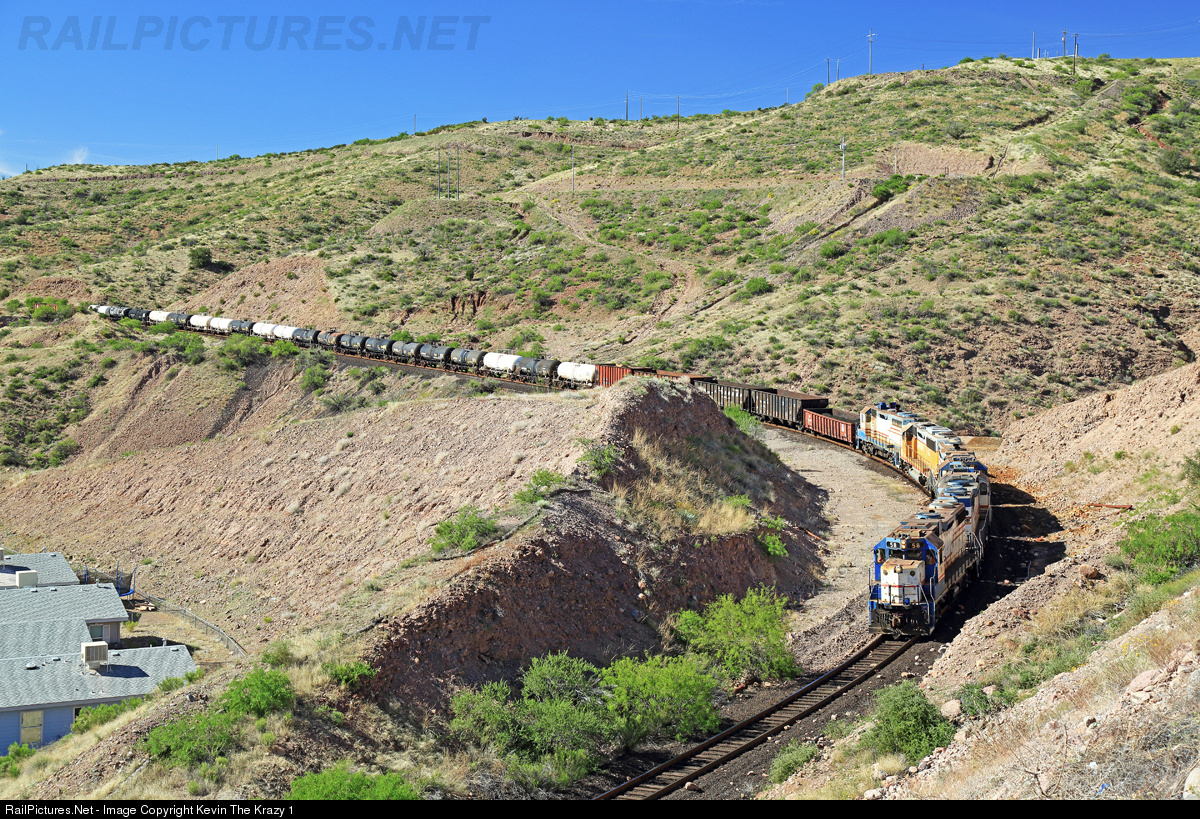 | Freeport-McMoRan Industries, formerly known as Phelps Dodge until 2007, 5-pack of re-geared GP38s ease down the 5% grade to the AZER interchange yard at the bottom of the hill. |