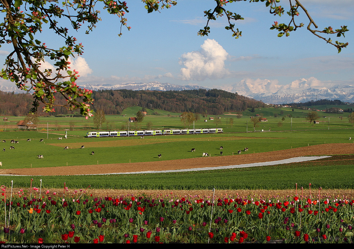 The tulips and cherry trees flourish when two low floor EMU run as S44 towards Belp-Bern through the Guerbetal valley. In the background the famous mountains Eiger, Moench and Jungfrau are visible. |