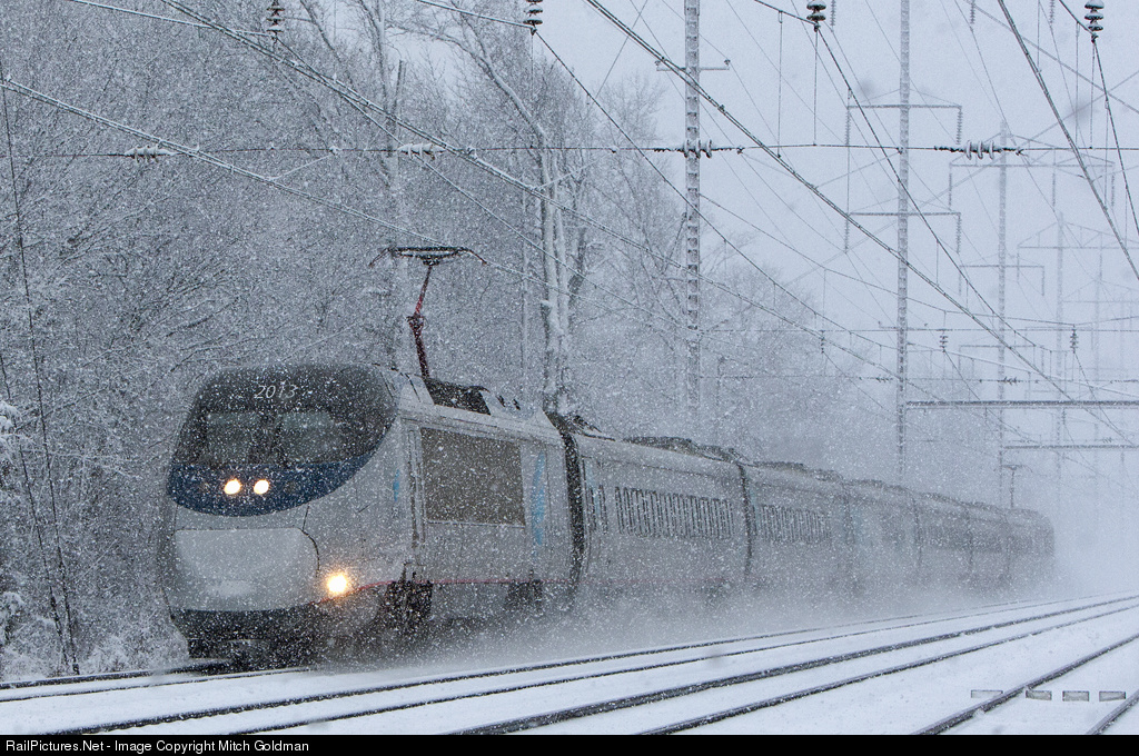 | Amtrak Acela Express led by #2013 fights it's way south through Bensalem township taking the outside track as it works it's way to Philadelphia, PA. To the far right, on the northbound track, you'll note a "dragging equipment detector" set up along various locations along the NEC.