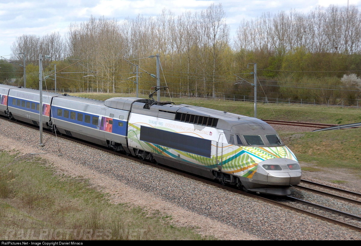 Detail on the special livery for the "Expo Milano 2015" on the engines of this high speed train who's coming from Milano in Italy and going to Paris Gare de Lyon terminus station. SNCF have designed this livery to celebrate the sponsoring of the "Exposition Universelle" in Italy this year.