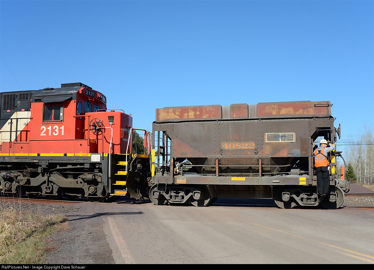 | DM&IR ore car 40822 was one of 500 in class U-23 delivered during 1948 from Pullman Standard, five years before the Missabe purchased its first diesels. Still in service for CN, the car still retains its ports for steaming ore (the two covers under the number and on the slope sheets). Steam locomotives would provide steam and pipes would be inserted into these ports for thawing frozen cars during late fall and spring so the ore would flow into dock pockets. Later in its career the car had side extensions installed and was renumbered to handle unprocessed taconite (iron ore) from the Thunderbird mine to the processing plant at Fairlane, where it is seen being backed to pick up a wounded sister for movement to the RIP track at Keenan yard. |