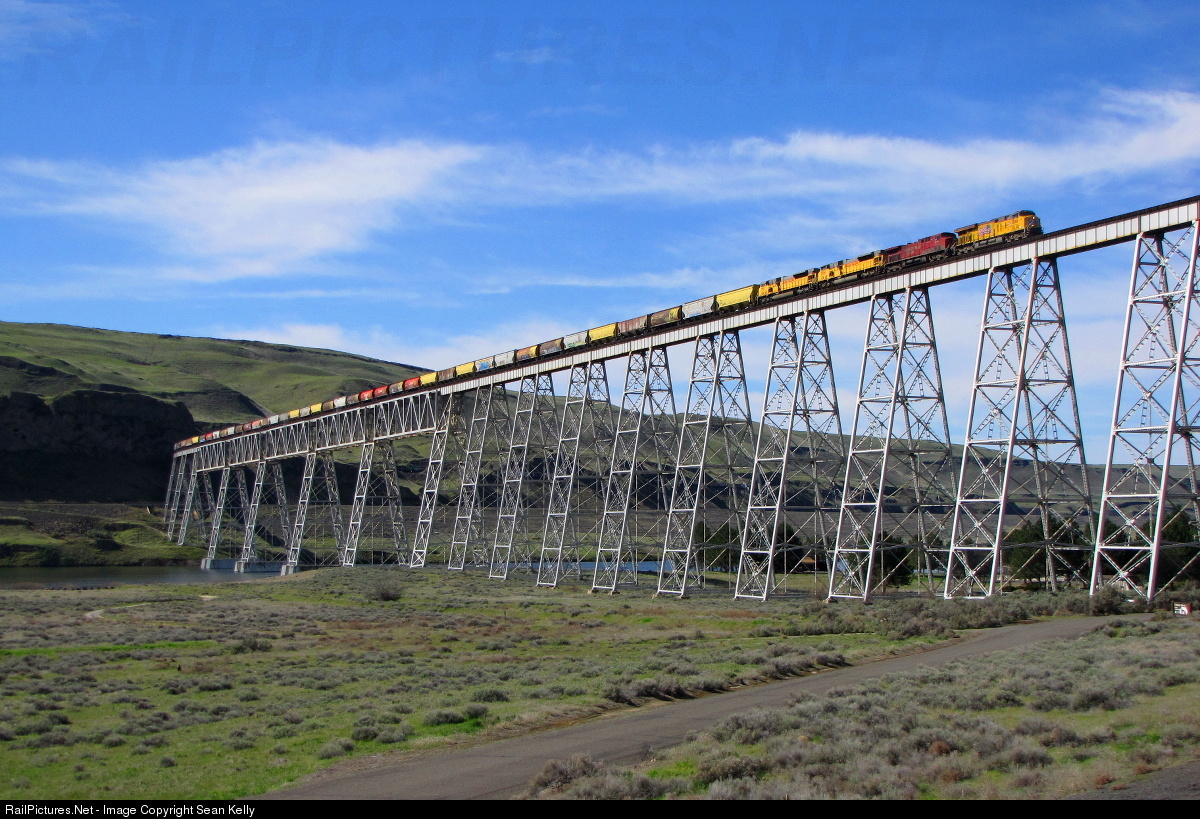 Two GE's and two EMD's lead a long northbound empty grain train slowly across the gargantuan Joso Bridge, vaulting across the canyon of the Snake River on UP's scenic Ayer Sub.