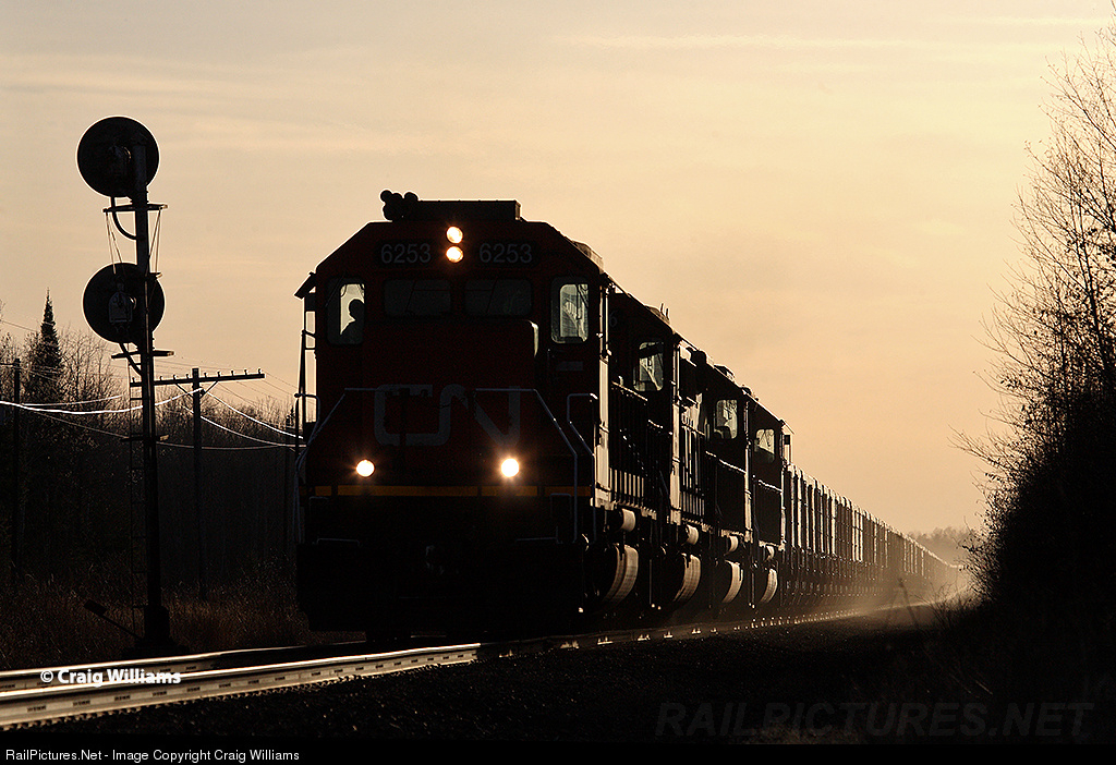 A loaded ore train out of Minntac Mine hammers east near sunset. With 145 loads in tow, these 4 SD40's make quick work of the grade coming out of Ramshaw. The train is seen passing the absolute signal at Fayal, and old control point that controlled the west end of the South Thunderbird Mine. Now the signals are more of a hold signal since the mine was closed in the 90's. Photo: taken on CN property, by CN employee.