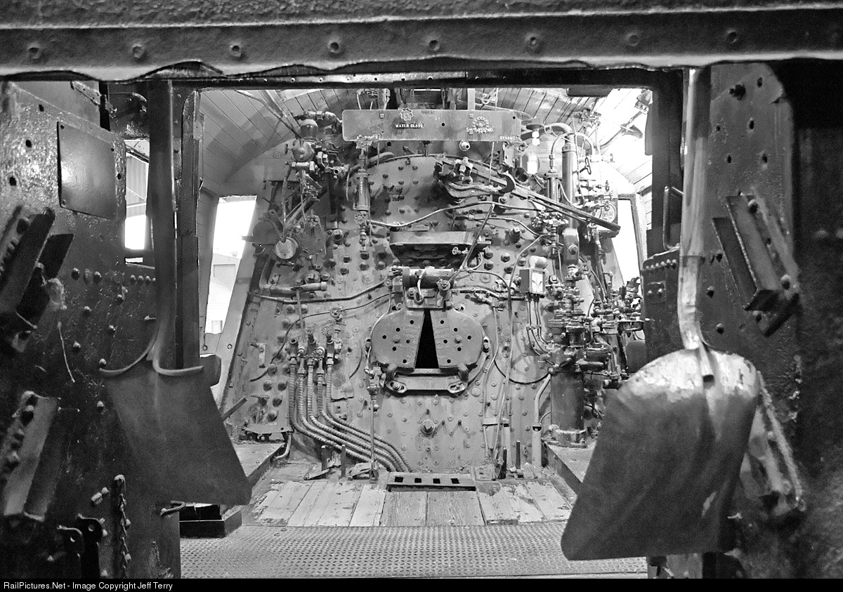 Inside the cab of DM&IR 2-10-2 No. 506, a "Santa Fe" type originally built for the Duluth, Missabe & Northern. This was the first E-1 class 2-10-2 built for the railroad in 1919, one of ten authorized by the USRA that year and built for the railroad by the American Locomotive Company. No. 506 last steamed in 1963 in ore thawing service.