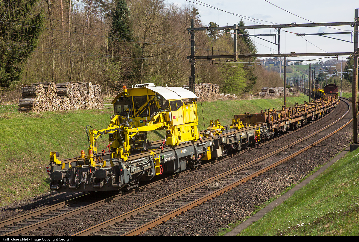 "Rail train" named "Silad 2" of the SBB, delivered by the german Robel company from Freilassing. The rail train transports, loads and unloads long welded rails in a safe, accurate and efficient manner. Maximum unloading performance: Loading and unloading approx. 2700 m/h. The yellow self-propelled crane can move across the entire train and grabs the rails with his tongs.