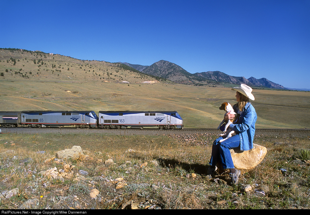 My wife Katie holds our 6-month old Beagle Riley, as they watch Amtrak’s westbound California Zephyr climb the two-percent grade toward Big 10 Curve west of Rocky, Colorado, on April 22, 2006. We still enjoy hiking out to “the curve” in open space with our two dogs—I only wish the railroad was as busy now as it was back then.