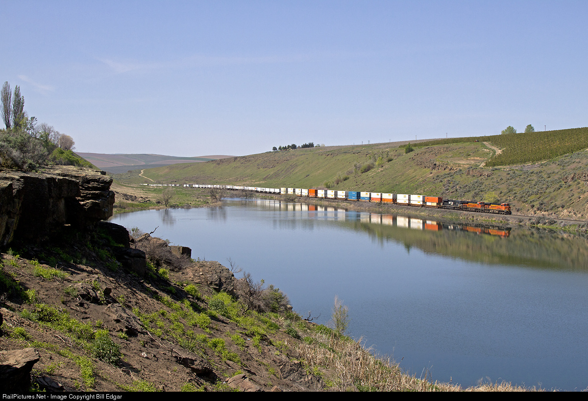 | A BNSF Q train climbs upgrade on the long Trinidad grade along Crater Lake a few miles west of Quincy, WA. The train will top the 16 mile grade at Quincy and race east to Spokane. Prior to BNSF's service meltdown, this train stopped to pick up refrigerated containers at Quincy. That business was lost last year and BNSF is facing a $40 million law suit. |