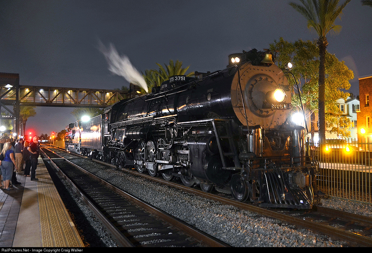 On April 30th, 2015, BNSF Railway train R-CAL0063-30A is unusual, as it consists of just BNSF ES44C4 8357 - running long-hood forward! - and Santa Fe 4-8-4 3751 being hauled backward from 3751's home at the Amtrak engine facility at Redondo Junction, just south of downtown Los Angeles. The train has just arrived at Fullerton, where both engines are destined for display at the annual Fullerton Railroad Days (on May 2nd and 3rd).