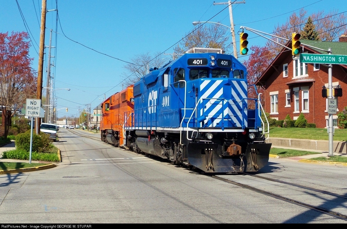| Colorful EMD freight motors are cruising down 11th street, under catenary wire, on a beautiful spring morning in Michigan City Indiana. |