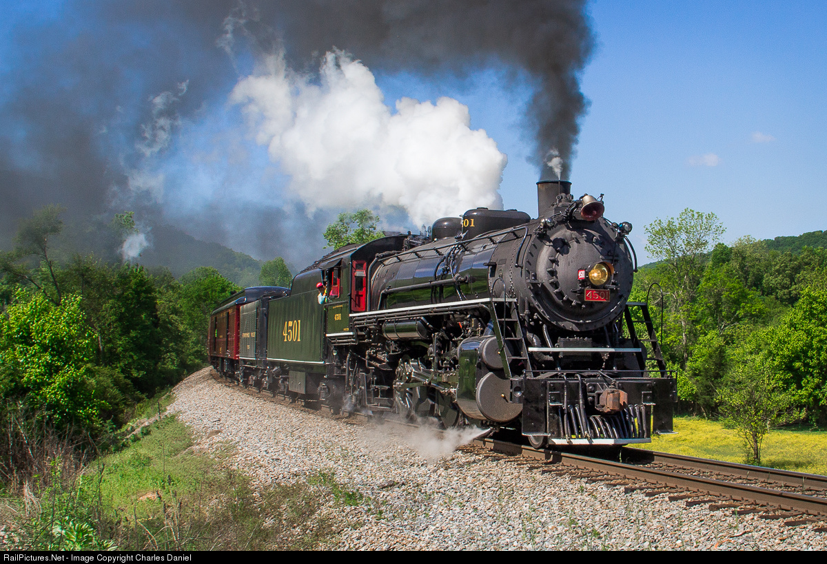| Southern 4501 pulls her tool car and 7 coaches up the 1% grade west of McDonald, TN with little struggle. Based on what was said after the flawless run, we should be seeing a lot more of 4501 in the future. |