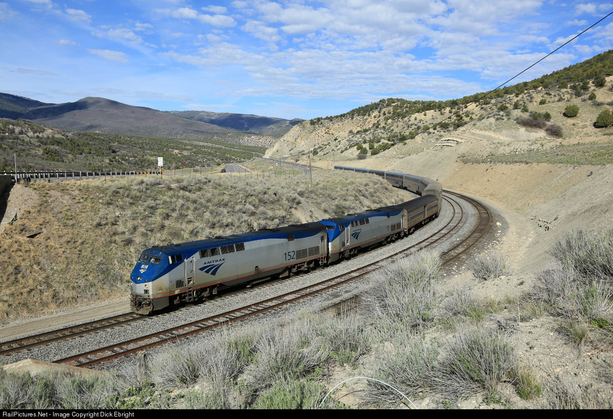 | A three plus hours late Amtrak #6 is just about to duck under US Hwy 6 at Gilluly, Utah. It will then be on the middle level of the Gilluly loops. The 2% grade here will continue all the way to Soldier Summit. |