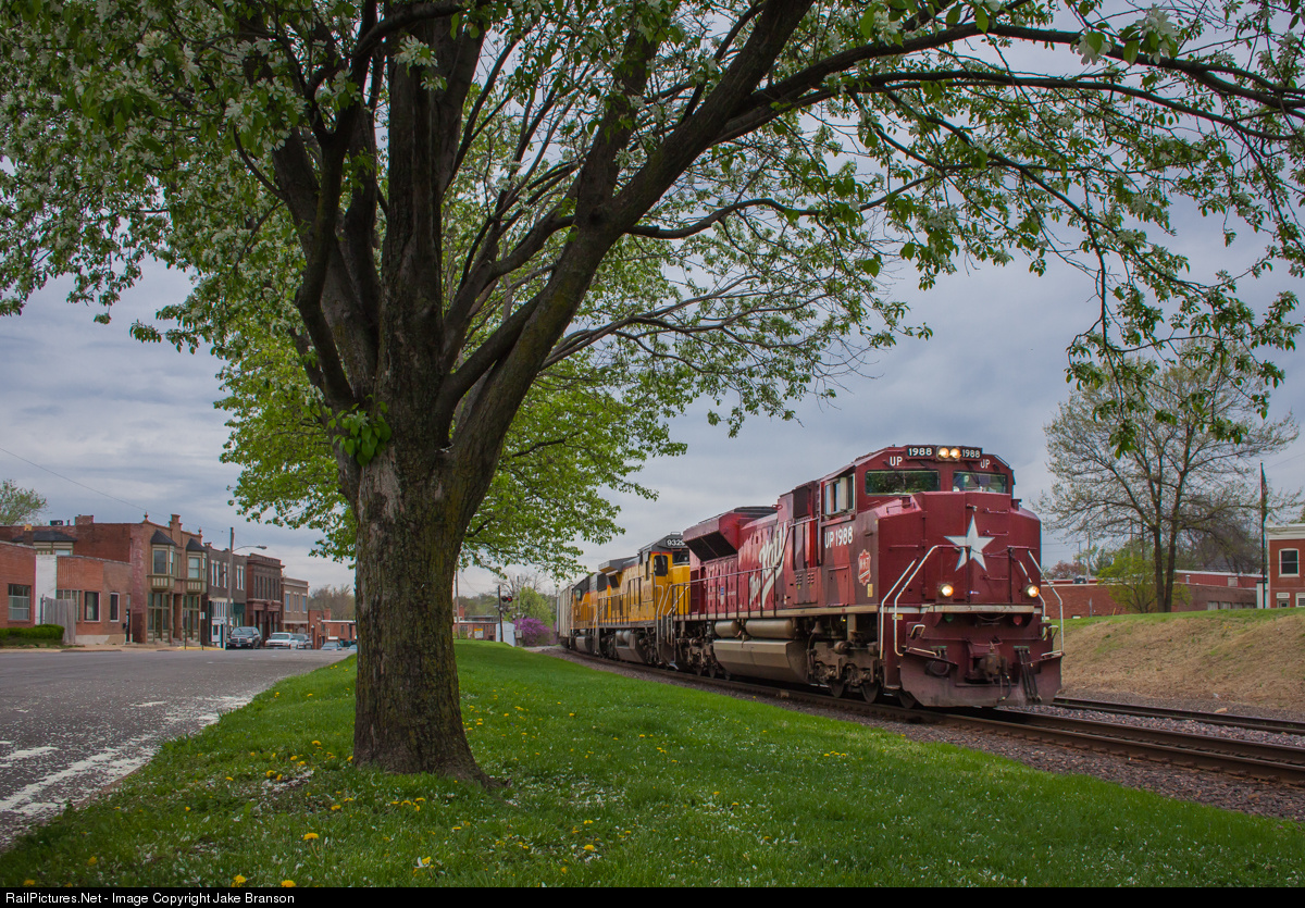 The row of trees along Greenwood Boulevard in Maplewood, MO, have nearly completed their blooming process as the Katy heritage unit passes in command of Gateway Yard bound manifest freight QNPAS. A pair of locomotives manufactured in the 1980s, a C40-8 and an SD60, round out the locomotive consist.