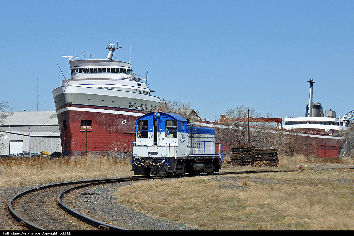After spotting cars at the elevator, the SW9 CHS 2117 rolls past the tied up laid-up ore boat Edward L. Ryerson.