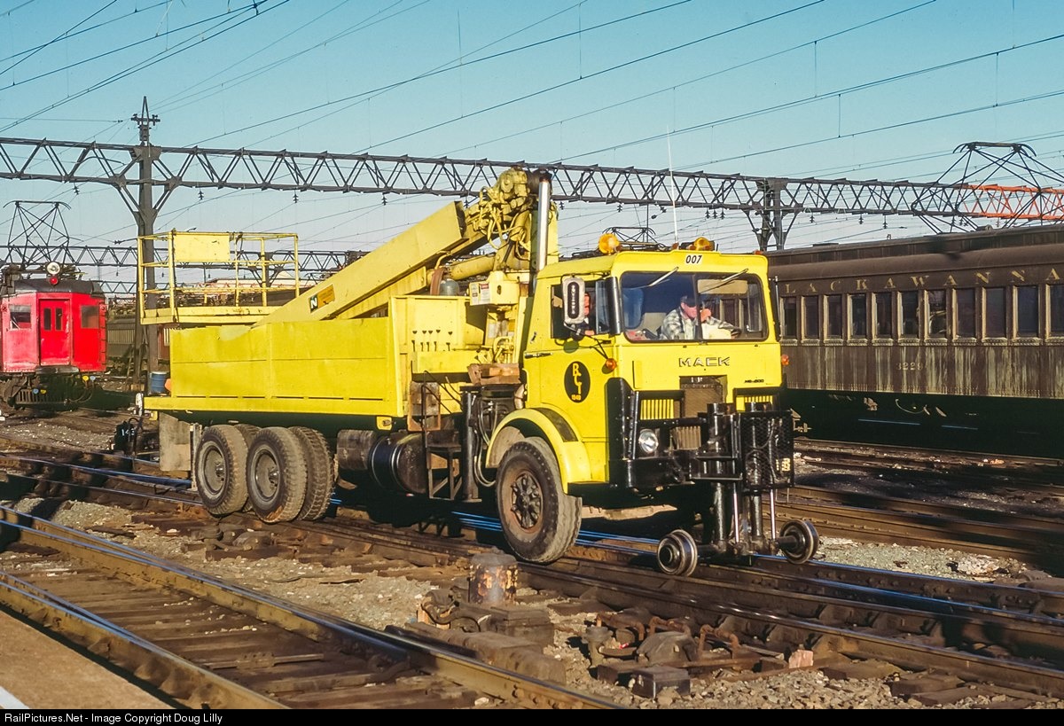 Miss Phoebe's Bulldog - 1982 was the 75th anniversary of the opening of DL&W's Hoboken Terminal. To celebrate the event, New Jersey Transit hosted the first Hoboken Terminal Festival. All types of equipment were on display, including Morristown & Erie's C430's. Here a contractor's hi-rail aerial lift is moved to its display position.