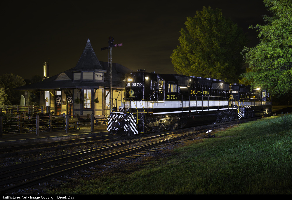 NS #3170 SD40-2 freshly painted in a Southern scheme, poses for a night photo by the station on the grounds of North Carolina's Transportation Museum on National Train Day.